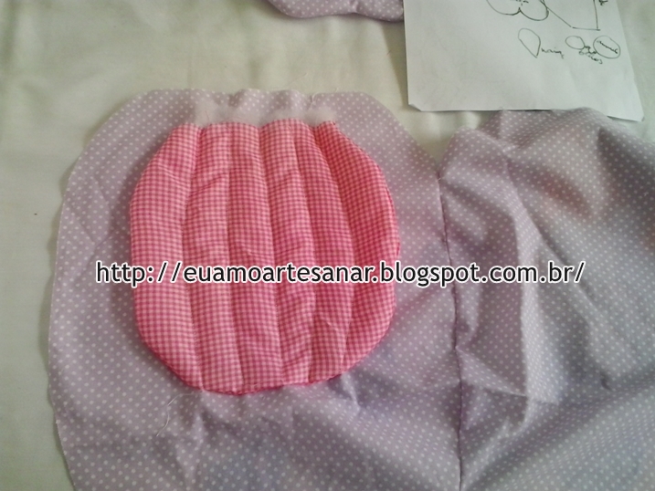 Passe uma costura em todas as partes cortadas, com a manta, menos no saco do puxa saco, em todo o contorno, deixando uma abertura para virar para o direito