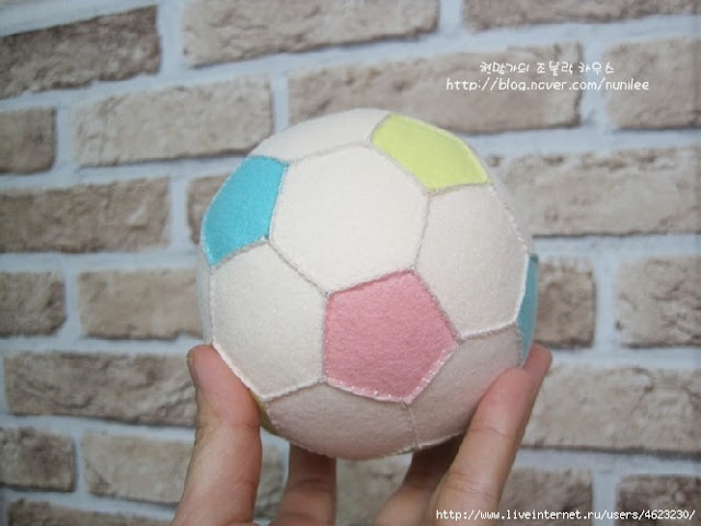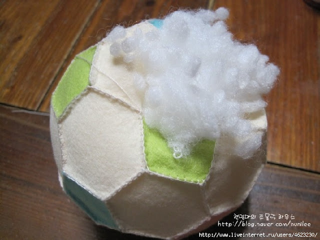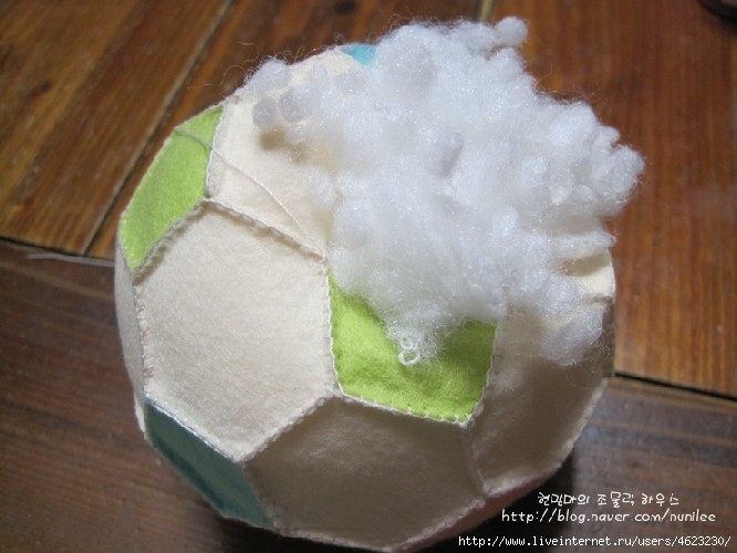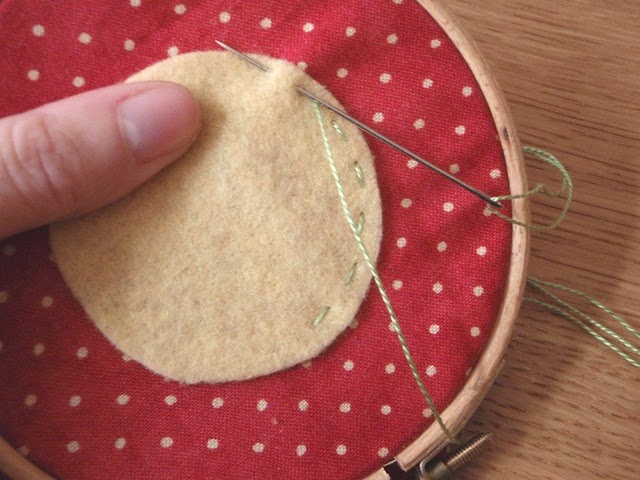 5) Corte dois círculos de tecido com um diâmetro de 12 cm. Coloque este com os lados direito juntos, pin e costurar, deixando um pedaço de 3 cm aberto. Dê ao redor snips no subsídio de costura e vire à direita para fora. Costurar a abertura fechada com a mão e imprensa.