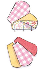 2) Coloque dois pedaços de três pétalas com os lados direito juntos em um semicírculo, alfinete e costure. Pressione as costuras abertas. Faça outra semicírculo.