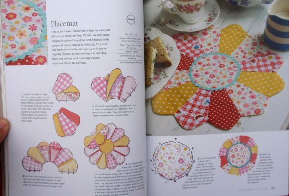 6) Coloque o círculo à direita no meio da flor de patchwork. Pin e ponto. Coloque o rickrack em torno de lá. Stik apertado e deixar as extremidades assim ordenadamente se sobrepõem. Pressione placemat.