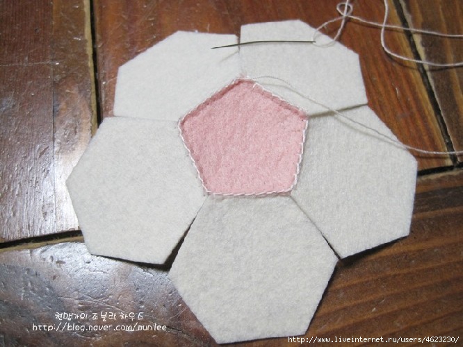 1) Corte o e-mail com o auxílio de um padrão. (Isto é de 70%, por isso, deve ser aumentada para 30%) Corte utilizando estes 12 pétalas de três componentes diferentes. Dispor de tal maneira que não há duas folhas da mesma cor são adjacentes. Coloque três pétalas com os lados direito juntos, alfinete e costure. Pressione as costuras abertas. Repita com os restantes pétalas.