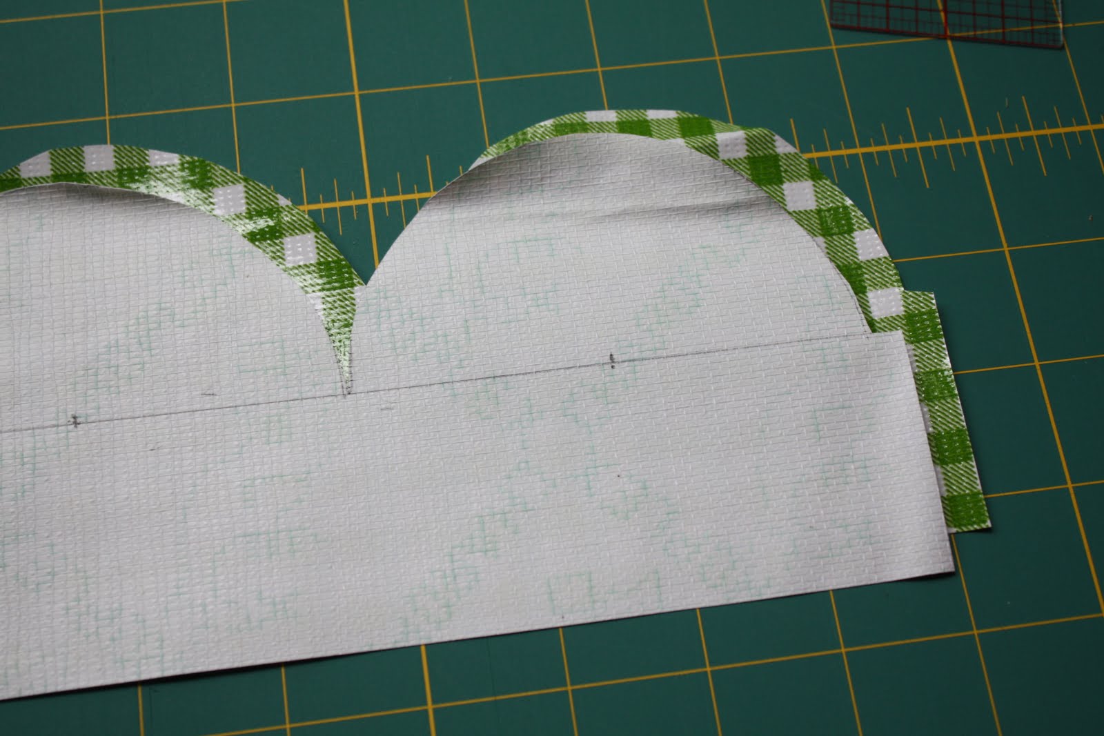 A régua flexível (mostrado acima) tem pequenos buracos cada 1/2 ", de modo segurando uma ponta de lápis em um (ponto de pivô) e uma ponta de lápis em outro 2" de distância e traçar o arco cria perfeitos semi-círculos de a largura desejada. Yay! Você também pode usar o método string (acima) ou um prato com um diâmetro de 4 ". Comece em 1/4" (para costura) da borda, em seguida, medir 2 "e marque com um ponto. Faça o seu arco. Continue em ... e em ...
