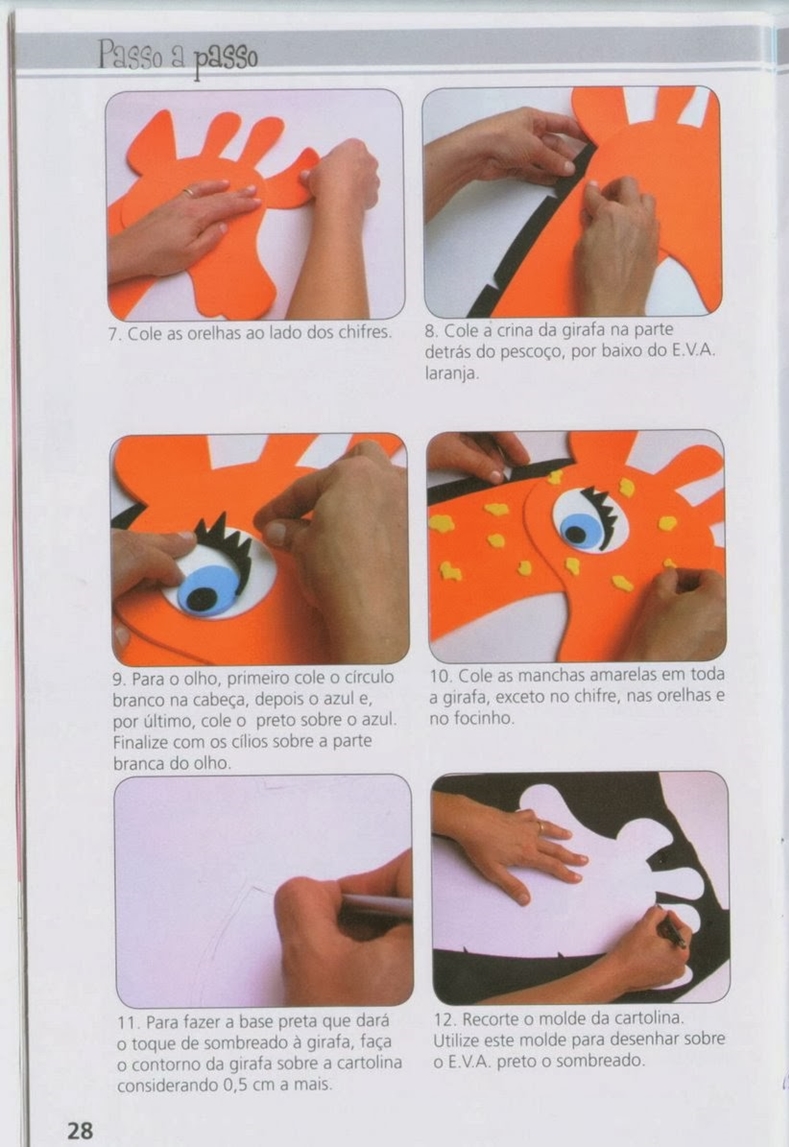 - Cole cada pedaço da girafa no tubo e, se desejar decorar o tubo com pequenos cortes em eva preta, para que pareça ainda mais com a girafa.