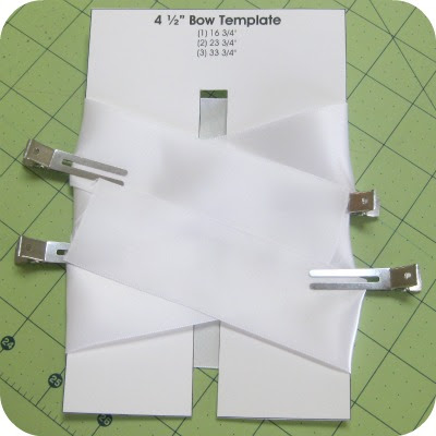 Use um clipe jacaré para segurar sua fita enquanto você a envolve em seu modelo. Prenda a fita no centro da "abertura intermediária" e no final do modelo.5 ”Template - 23” Ribbon - 3 ”Bow