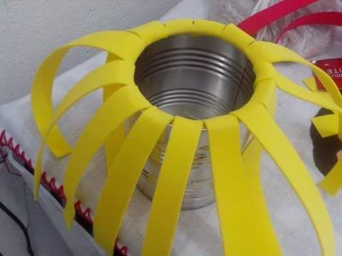 Em seguida, cole as tirinhas também na borda da lata e amasse, para fazer um bom acabamento.