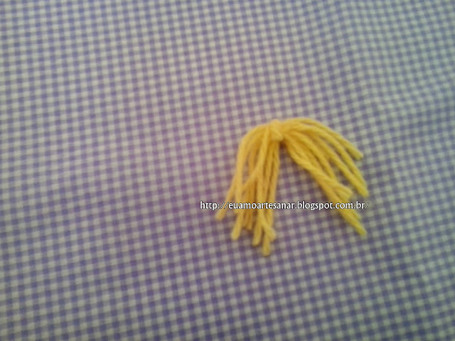 E comecei a fazer cabelinho no boneco, comecei pela franja, frente da cabeça