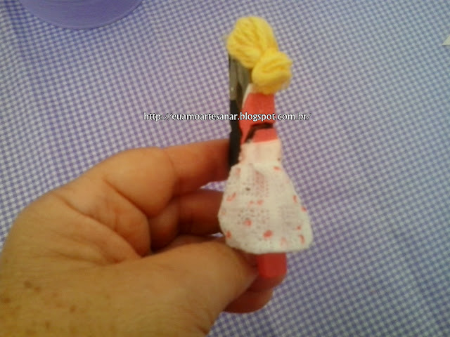Peguei um alfinete com cabeça de bolinha e fiz bolinhas em toda saia com a mesma cor de tinta que pintei a bonequinha
