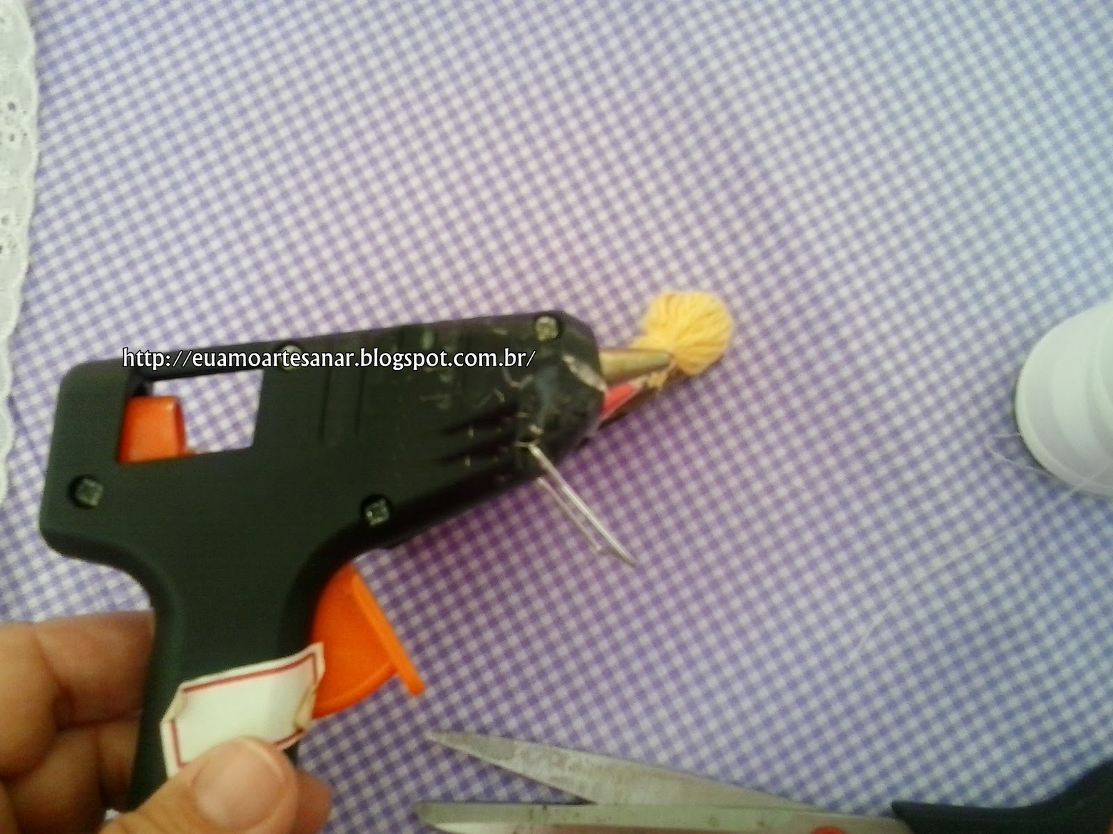 Fica assimColoque cola quente no topo da cabeça da menina e cole o cabelinho, onde tem a lã que amarrou