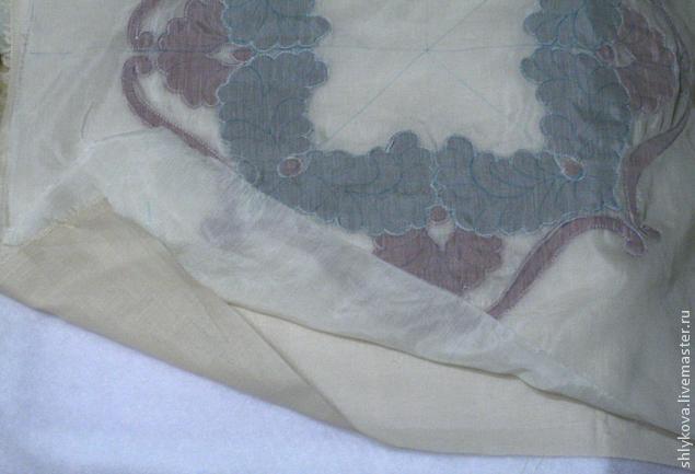 O primeiro painel é feito. A rebatidas perdeu um pouco de sua forma. Isso provavelmente não teria acontecido se eu tivesse usado um tecido de suporte. Não importa, porque a artesã tinha feito algumas concessões para o encolhimento.