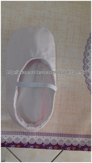 Agora vamos colocar as sapatilhas nos pés para medir aonde vai ser colocado o elástico. Enfie o elástico, ente as 2 sapatilhas(veja na foto abaixo)
