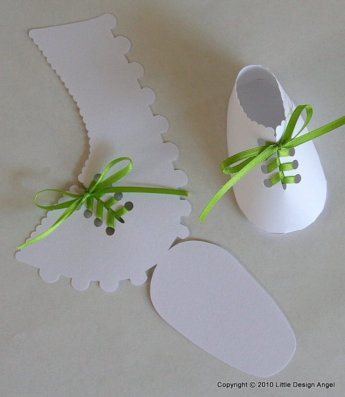 5. Com uma fita amarrar um laço da mesma cor e colá-lo na parte superior do sapato, como se fossem os atacadores.