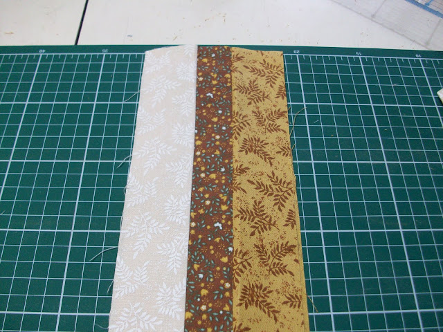 Costure as três tiras de 60x8cm no sentido do comprimento, intercalando as estampas.