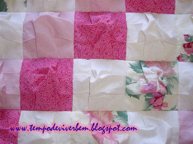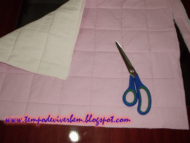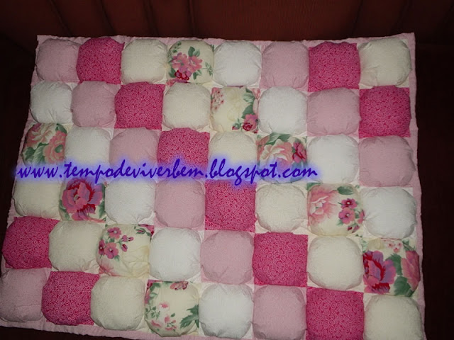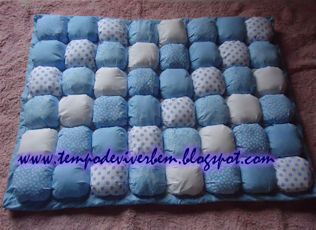 Com o topo pronto, faça uma tira de 5 cm de largura por 250 cm de comprimento, e costure em volta para fazer o acabamento final. Fica muito mais difícil fazer isso com os quadrinhos recheados.