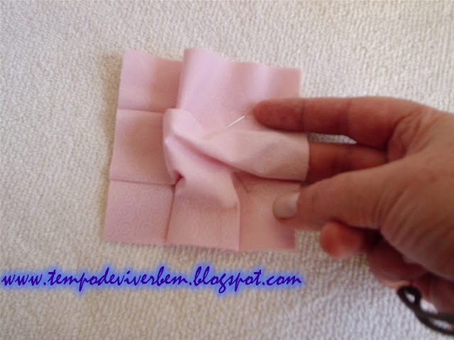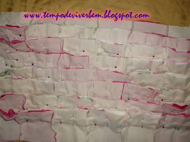 Alfinete, primeiro emenda com emenda, depois o meio com meio, ajeitando as pregas, e procurando jogar a emenda da tira de cima para um lado e da tira de baixo para outro lado.