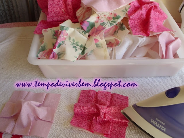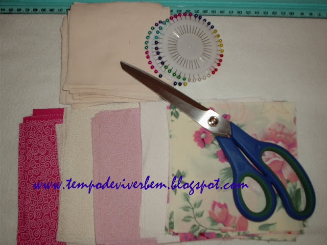 Para o topo cortar 10 quadrados de 13 cm de lado de cada tecido escolhido.