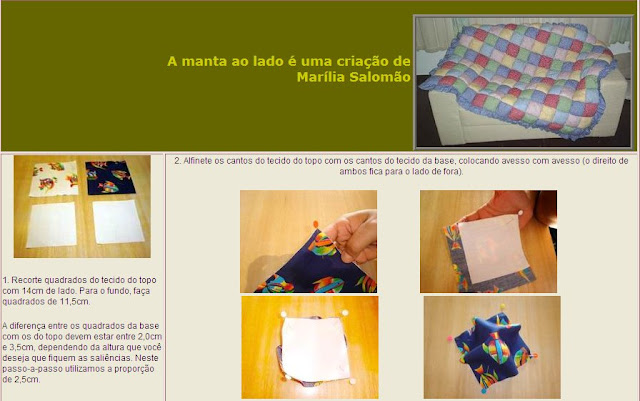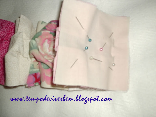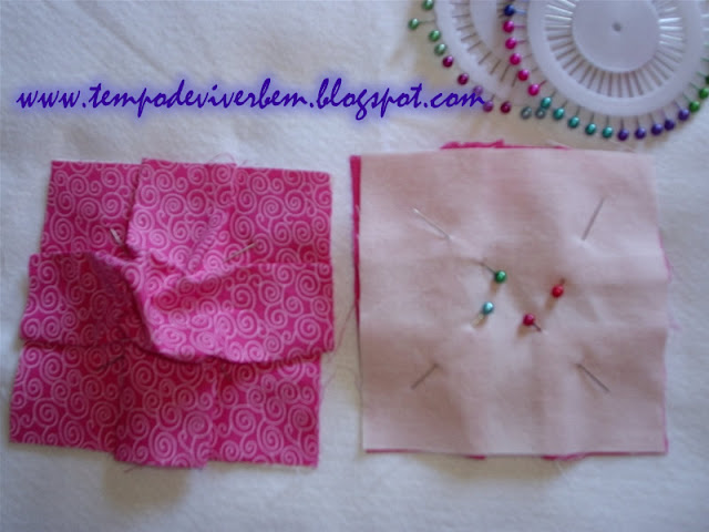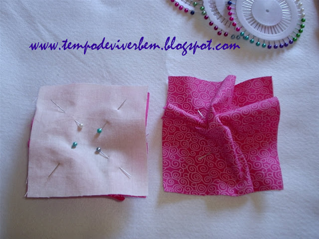 Alfinete um quadrado ao outro, acertando cantinho com cantinho, formando as tiras.
