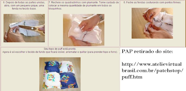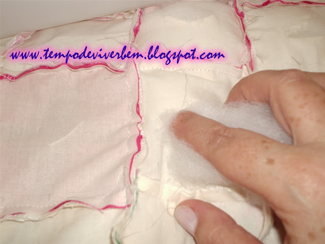Agora sim...Faça um corte em cada base dos quadradinhos, encha com o plumante (fibra siliconada ). Procure colocar a mesma quantidade em todos os quadrados.